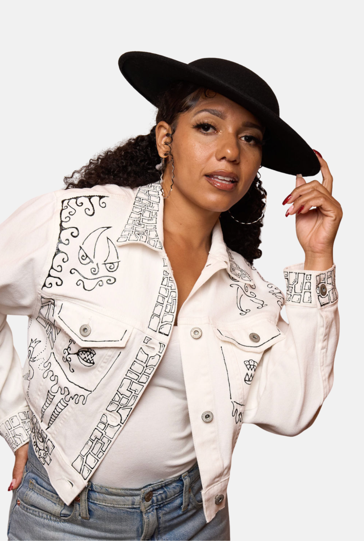 The shape of this hat is inspired by a hat from my grandmother, Esther. I got this shape custom made into a hat block so I could create this shape in any color felt and adorn it in countless ways. In the Basics Collection it shines through with it's chic and tieless silhouette. Pictured here with a playful Doodleverse hand painted jacket.